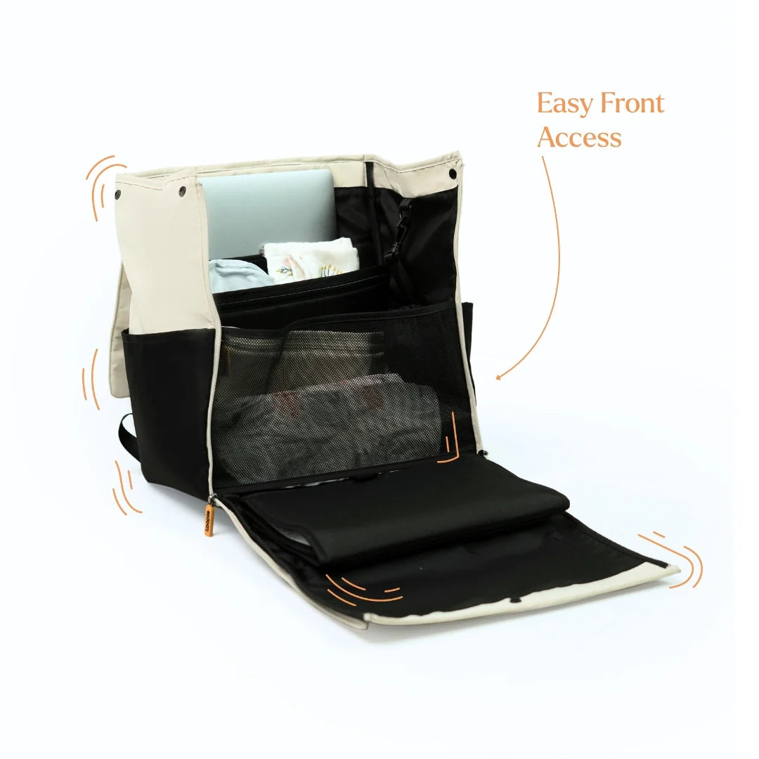 The Robin goes wherever you go. Wear the baby diaper bag in backpack mode, side-carry mode or attach it to your stroller for hands-free travel.