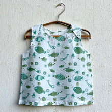 - All-over handblock printed patang or kite design in the colour of sunshine is accompanied by fishes in cool mint.