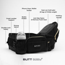 - The Butt-Baby offers 6 different carry positions and multiple safety features. It's also designed to store items like diapers, wipes, and other essentials inside. While not in use the Butt Baby-Seat can be folded into a sling and be carried around with ease. The Butt Baby-Seat also has a foldable shopping bag inside, stash in stuff and go hands free!