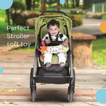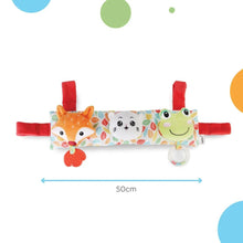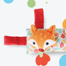 - With three cute characters ??? a fox, a cat and a frog ??? attached to a multi-colored soft fabric, the toy adds vibrancy to any baby furniture!