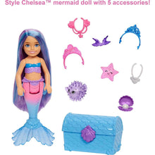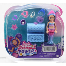 - Chelsea doll features an ombre tail with a glittery blue fin and extra-long fantasy hair. With two sea animal friends and a chest that opens and closes, kids can play out a fantastical treasure hunt. And with so many sea-inspired accessories, they can style Chelsea doll for any adventure! With Barbie Mermaid Power dolls, kids ages 3 years old and up can recreate their favorite moments or dream up tales of their own. Each sold separately, subject to availability. Doll cannot swim or stand alone. Colors and decorations may vary.