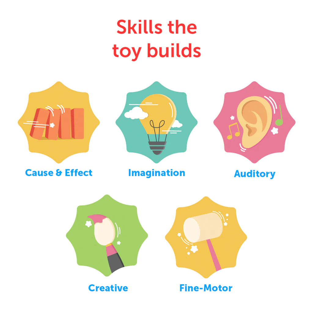 The drumstick has a rubber stopper to make a pleasant sound when striking the drum. Playtime with the Square Tone Drum helps develop fine motor skills, hand-eye coordination, auditory skills, recognition skills & concentration.