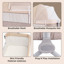 Adjustable bedside bed: Just open the cot from one side by unzipping the chain given attach the cot to your bed and make your baby sleep beside you.