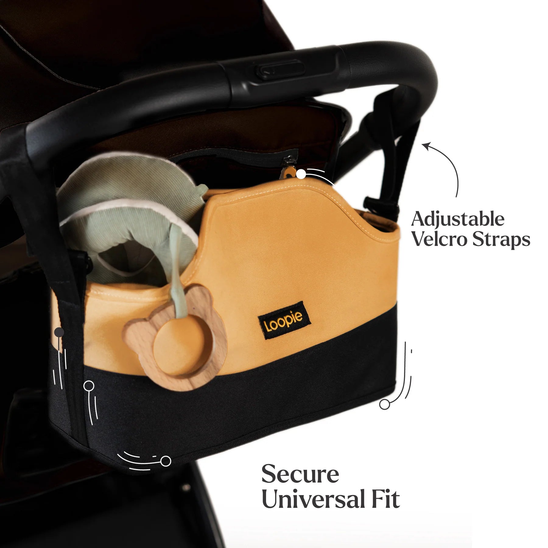 Use: Attach to the Stroller with Velcro Straps. Can also be used separately as a Caddy
